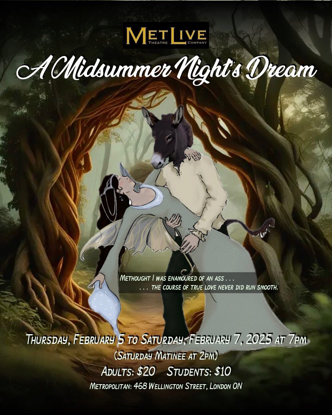 Samuel Craig - A 17 year old, Grade 11 student portraying the character of Nick Bottom. Samuel is currently attending Central Secondary School. This is his second performance with MetLive, previously portraying General Mackenzie in “And Then There Were None”. Outside of school and theatre, Sam’s hobbies include cooking and baking, playing guitar and viola, and singing.